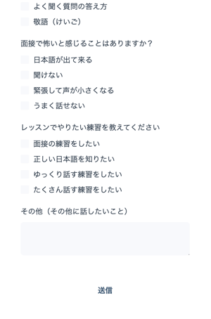 必要事項と練習したい内容を記入した上で「送信」ボタンを押すと、申し込みが完了します。