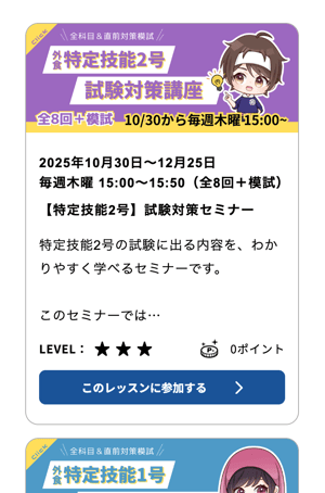 「イベントレッスン」ページで、参加したいレッスンを見つけ、「このレッスンに参加する」ボタンをクリックします。