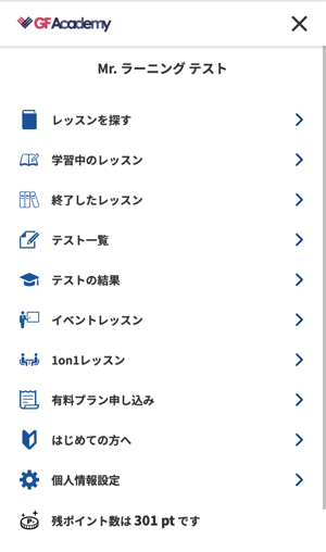 GF Academyのトップページにアクセスし、画面左側のメニューにある「イベントレッスン」または「1on1レッスン」をクリックしてください。