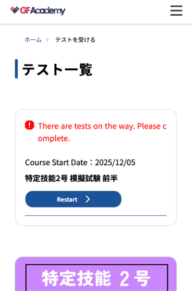再度「テスト一覧」ページにアクセスすると、受講途中のテストが上部に表示されます。