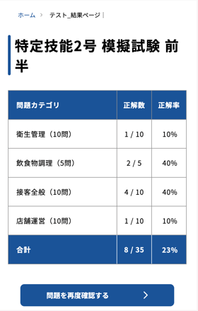 4-4.結果の画面にある「問題を再度確認する」ボタンを押すと、正解・不正解が明示された問題画面に戻り、どこを間違えたのか復習することができます。