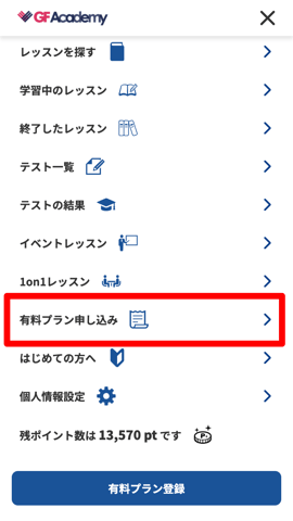 1. メニューから 「有料プラン申し込み」 ページを開いてください。
